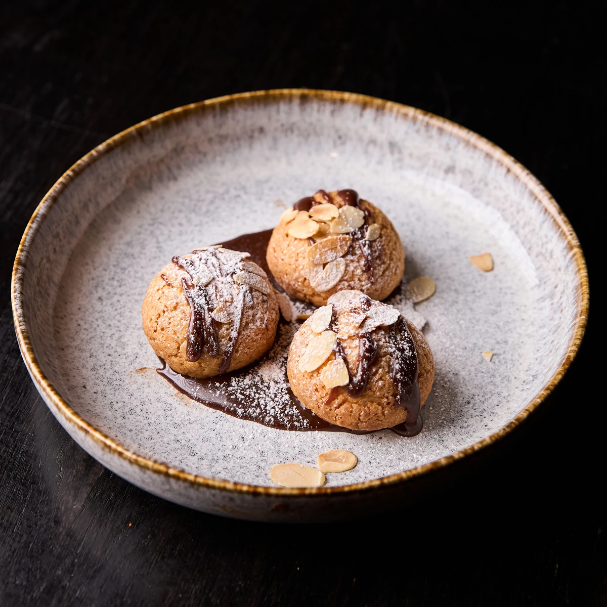 Shu cake with custard cream, chocolate ganache, almond flakes