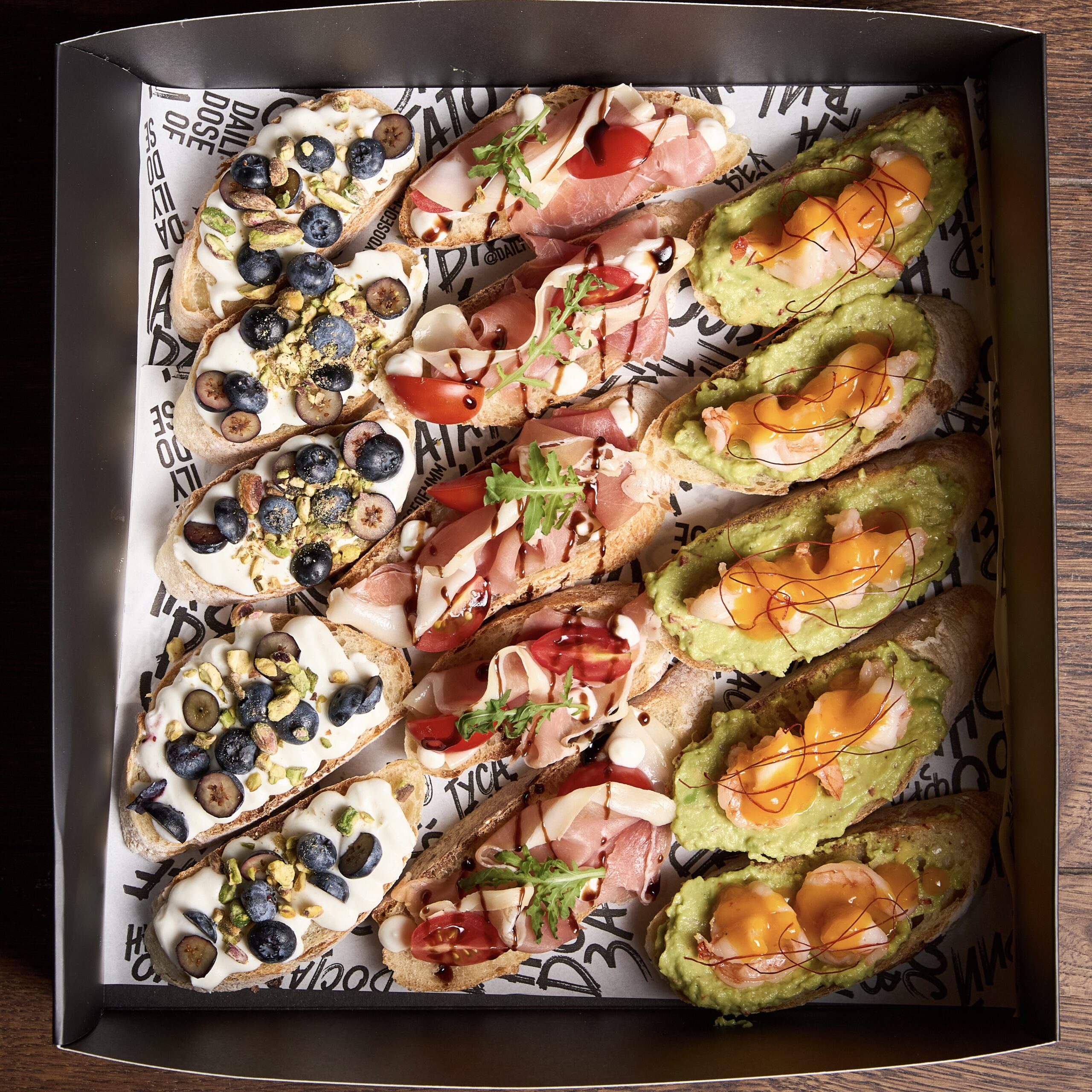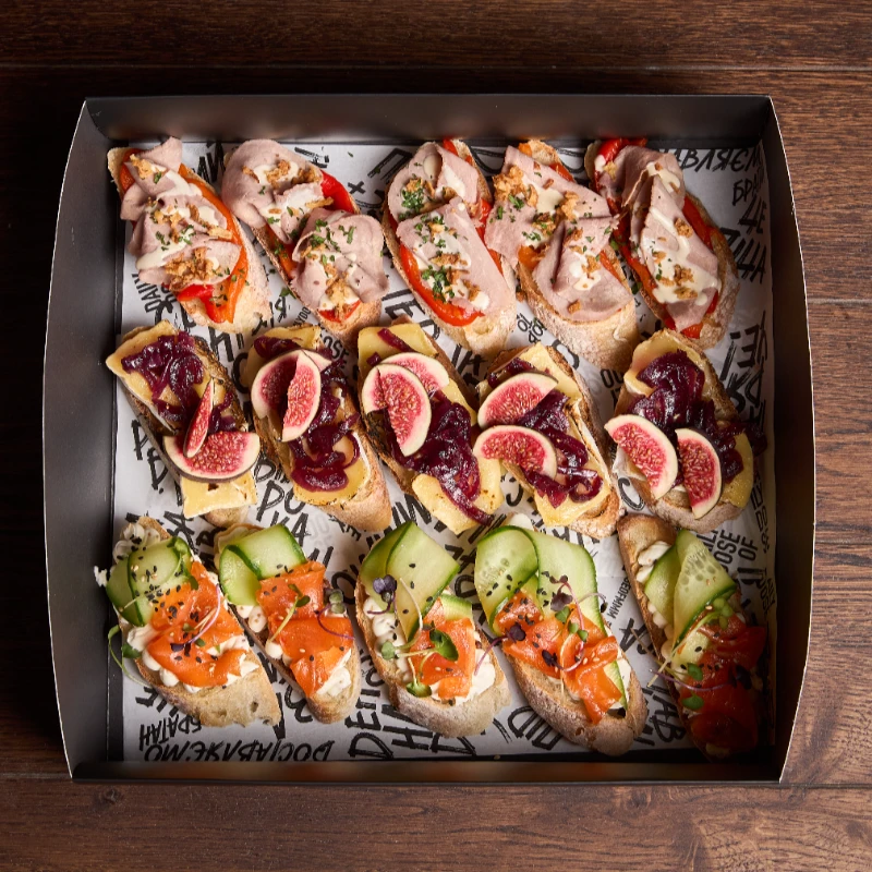 Three classic gourmet dishes on crispy baguette: tender salmon, creamy…