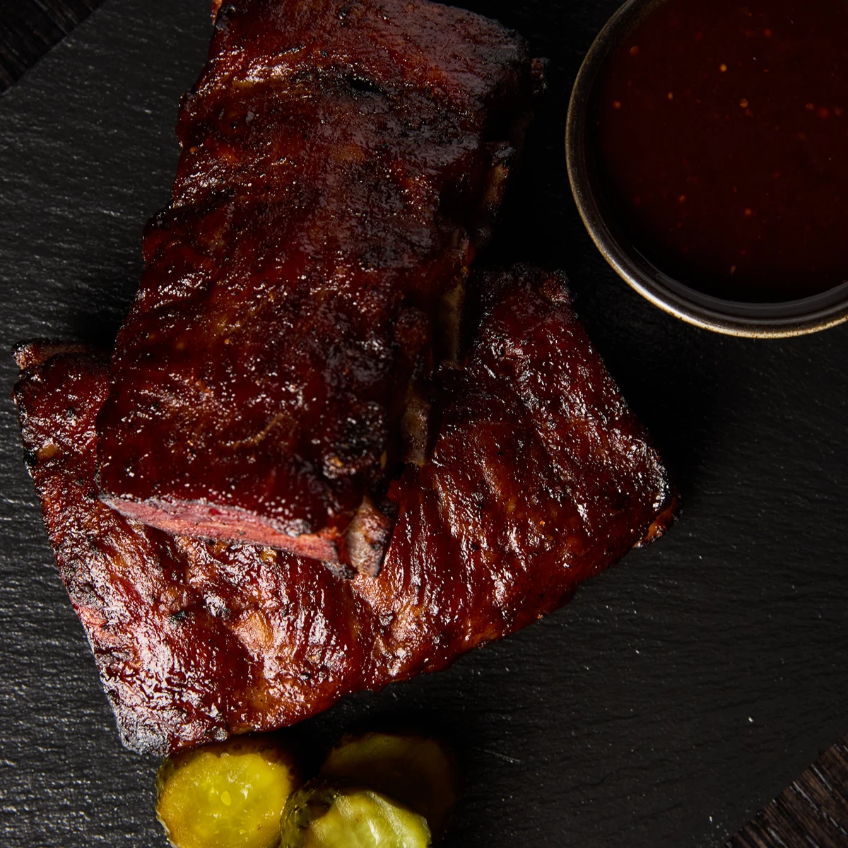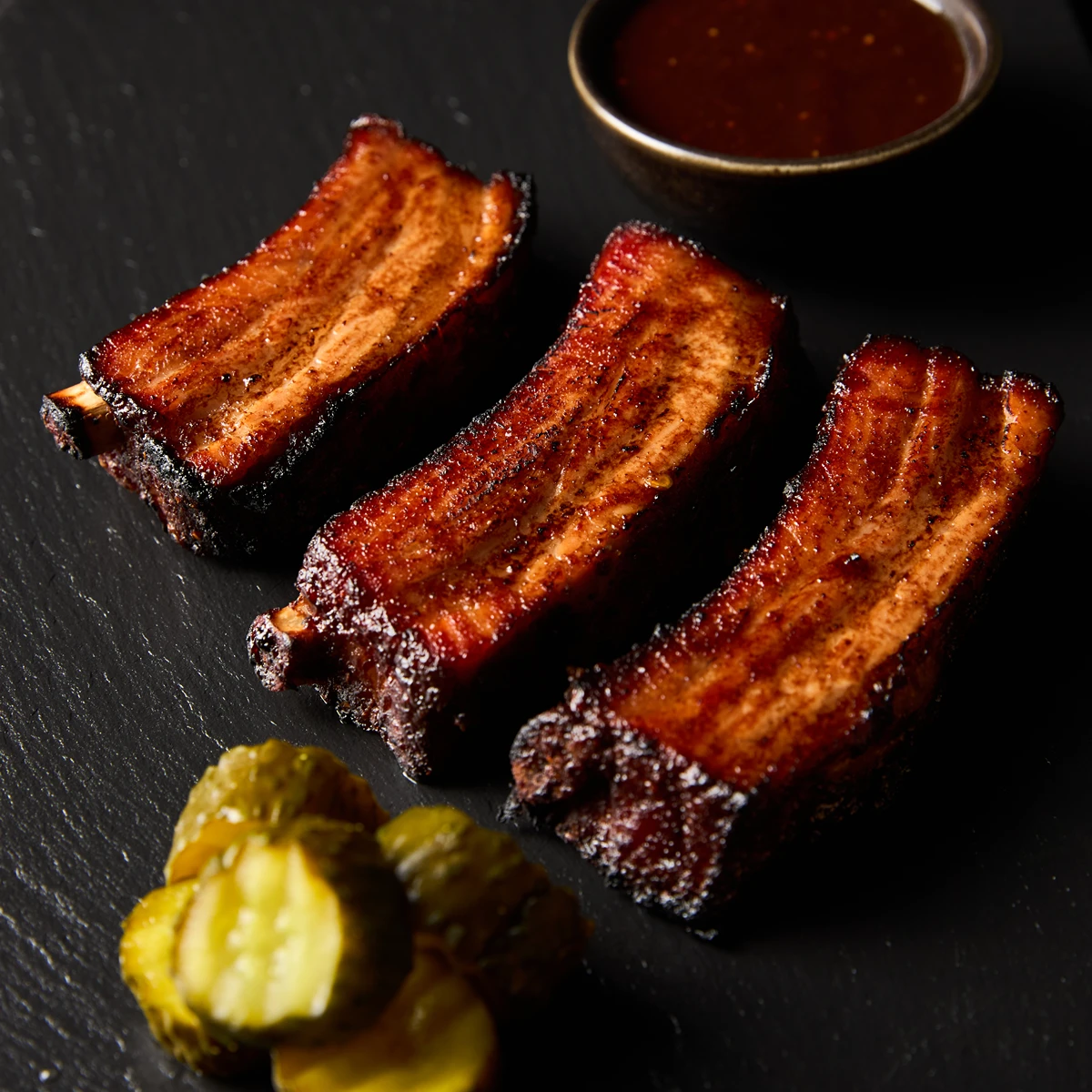 Pork ribs served with pickeled cucumbers, BBQ sauce based on…
