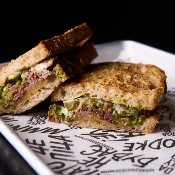 Spelt bread, jalapeño sauce, beef cheeks in orange BBQ sauce, peanut butter, caramelized onions, pesto sauce, aged cheddar, jalapeño.