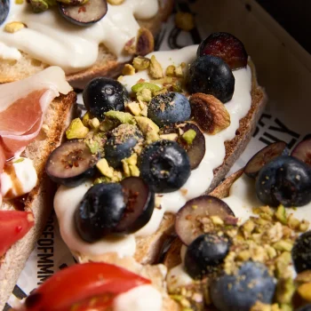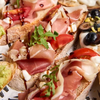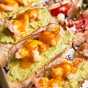 A set of bright flavors: delicious jamon, juicy shrimp, and spicy goat cheese — the perfect mix for wine or sparkling wine.
