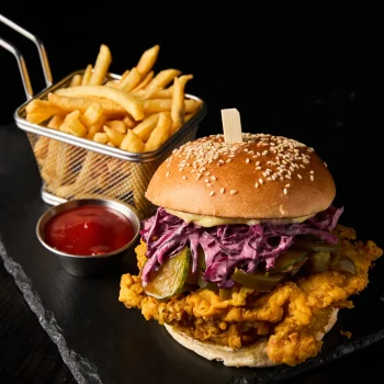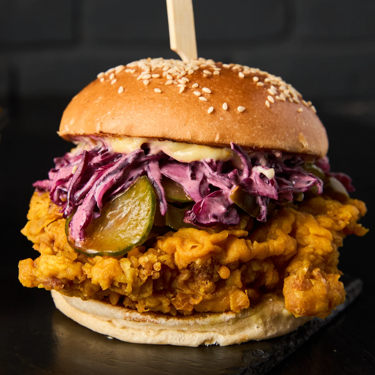 Chicken thigh in curry-based marinade in crispy breading, caramelised bacon with leeks, kow sow cabbage, jalapenos, broken cucumbers, kimchi, mustard sauce.