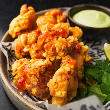 Breaded chicken thigh, sweet chilli sauce, sweet wasabi sauce, sprinkled with spicy Tagarashi seasoning