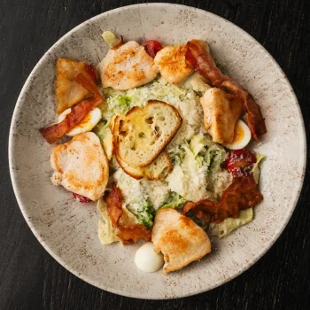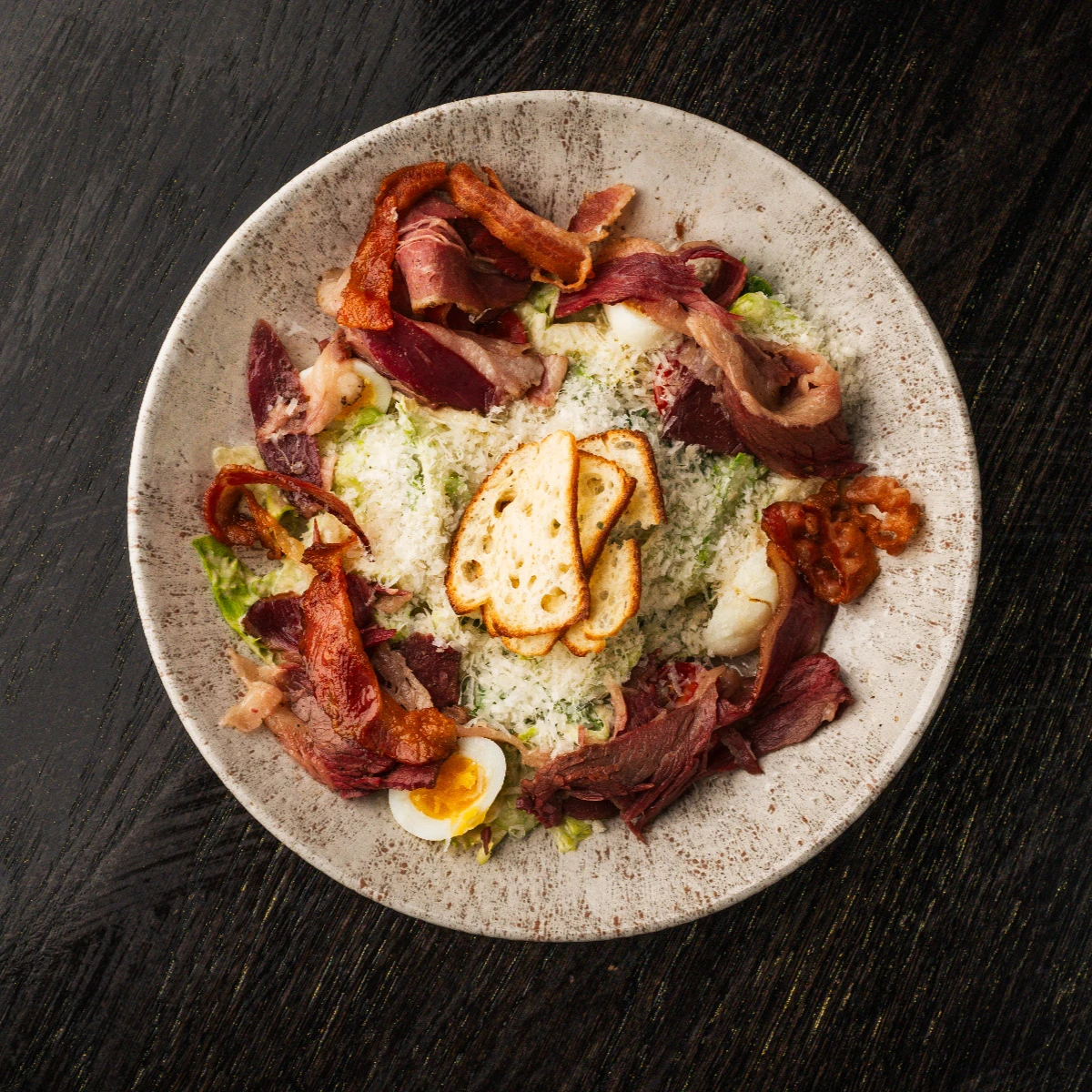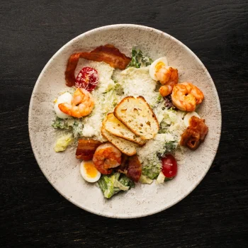 Mixed salad, cherry tomatoes, quail eggs, bacon, Parmesan cheese, Caesar sauce