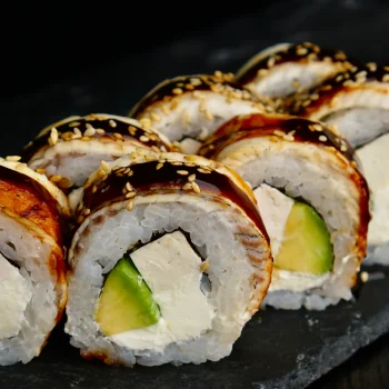 eel, Philadelphia cheese, avocado, tofu cheese, unagi sauce, sesame seeds