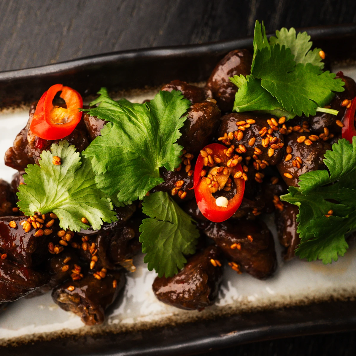 Chicken hearts in tempura, cilantro, sweet chilli sauce, spicy sesame seeds, chilli.