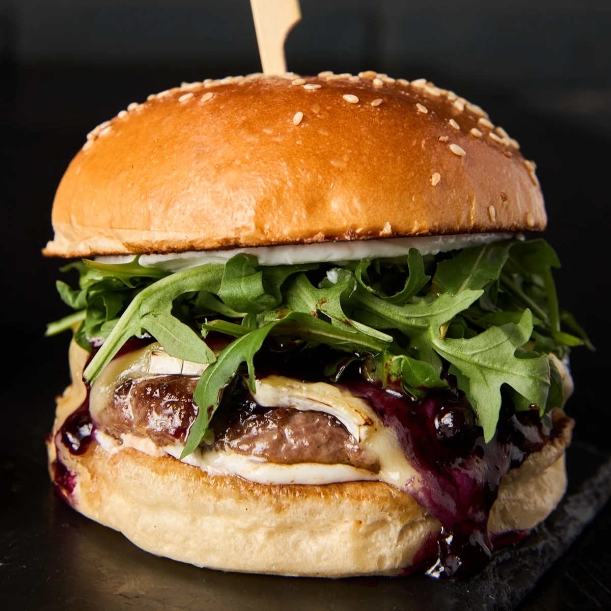 Beef cutlet, Brie cheese, dor bleu, blueberry confit, Aglio Olio sauce, arugula