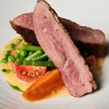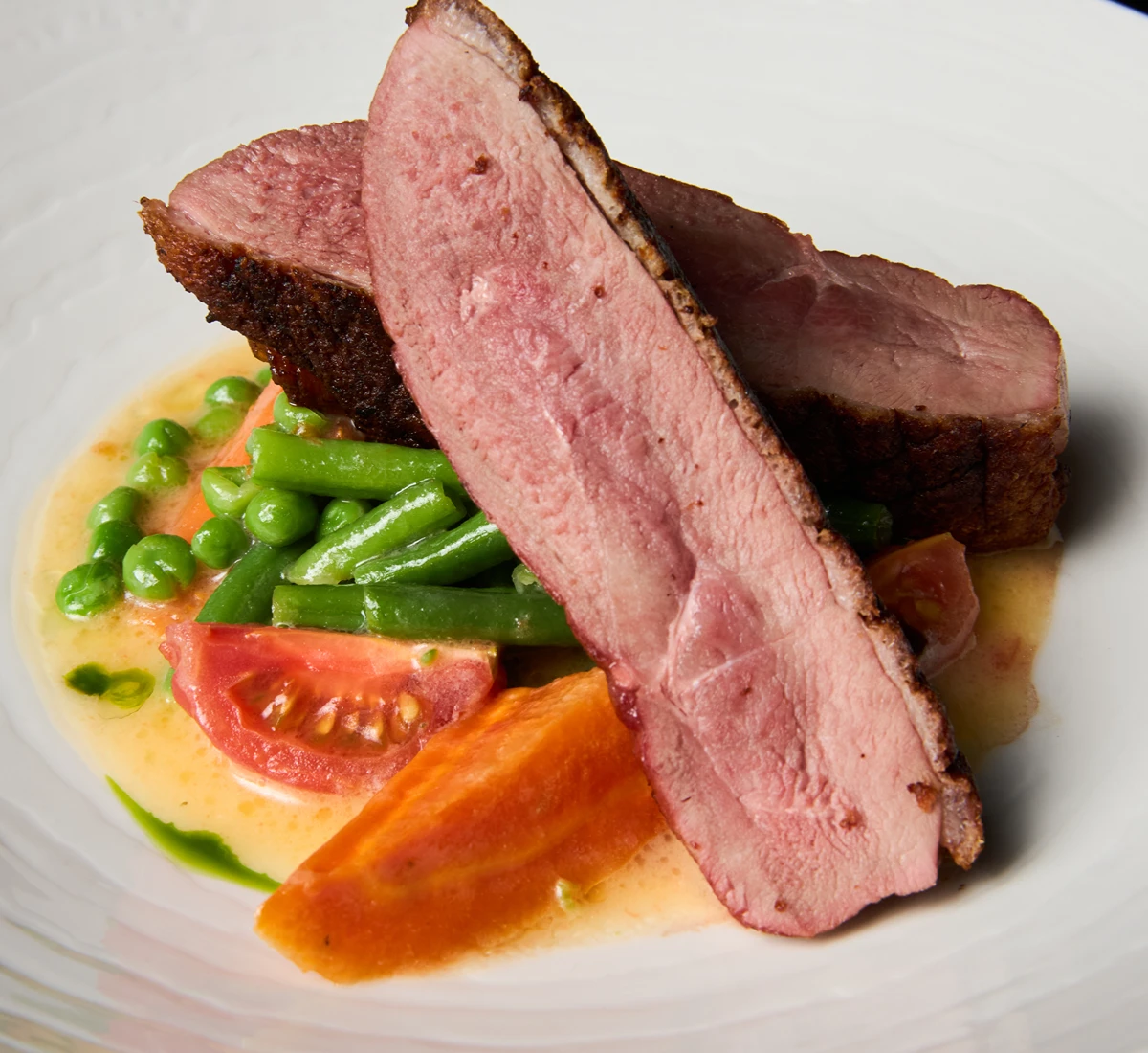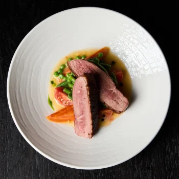 Tender duck fillet fried in horseradish. Garnish: carrots, chanterelles, cherry tomatoes, green peas, emulsion based on chicken broth and butter