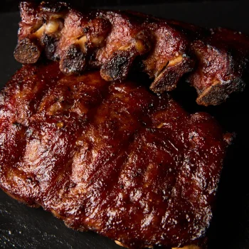 Pork ribs served with pickeled cucumbers, BBQ sauce based on lekvar (prune jam)
