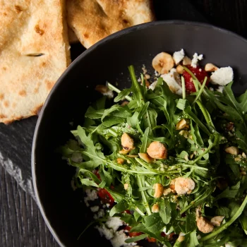 Roasted peppers, feta cheese, olives, hazelnut , olive oil with chimichurri, arugula. Served with focaccia