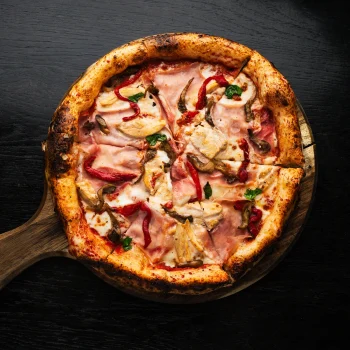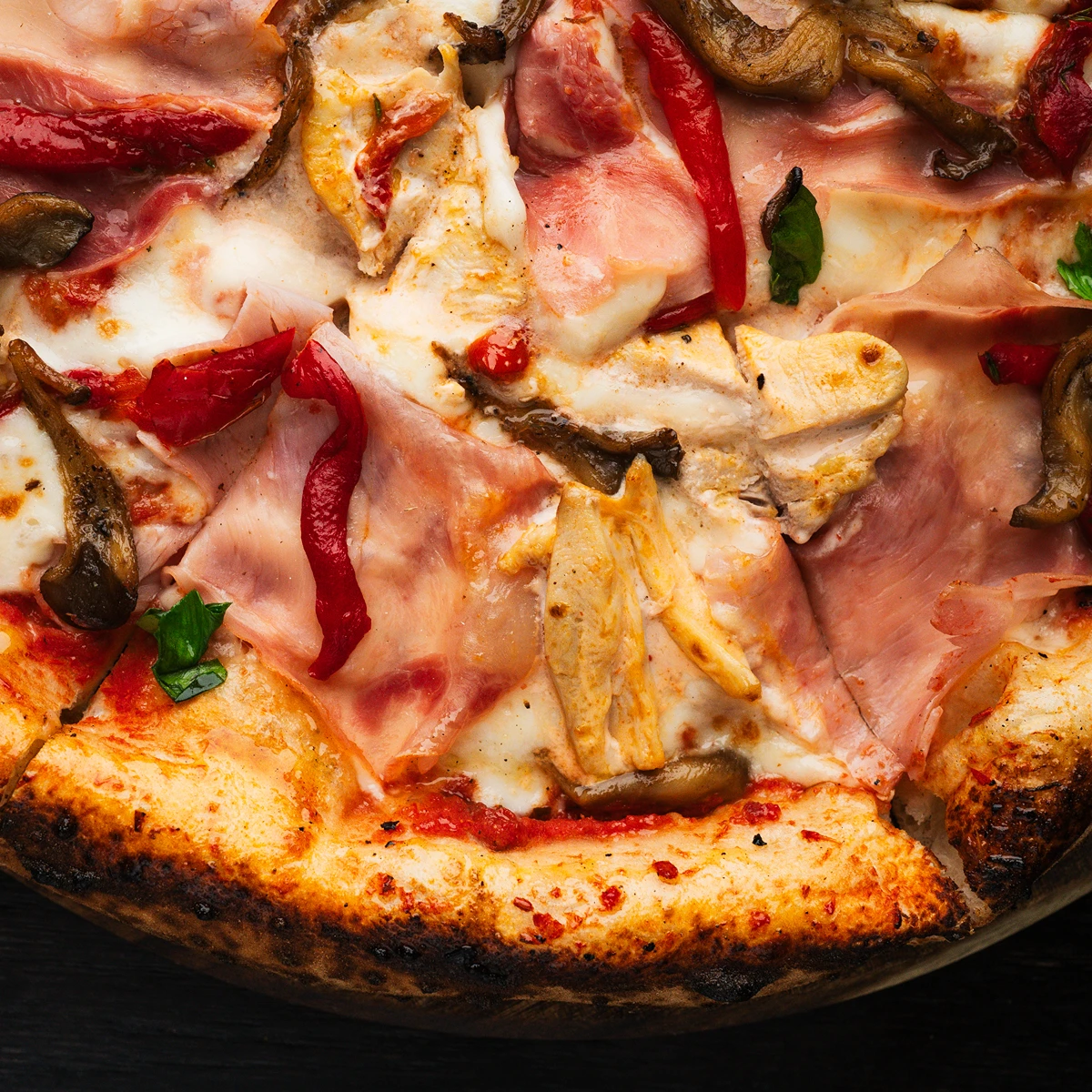 Tomato base, chicken fillet in creamy  sauce, prosciutto cotto, oyster mushrooms, baked bell pepper fillet, mozzarella.
