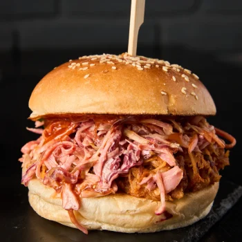 Pulled pork in BBQ sauce, kimchi cabbage, coleslaw salad