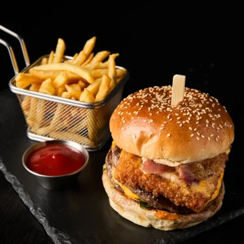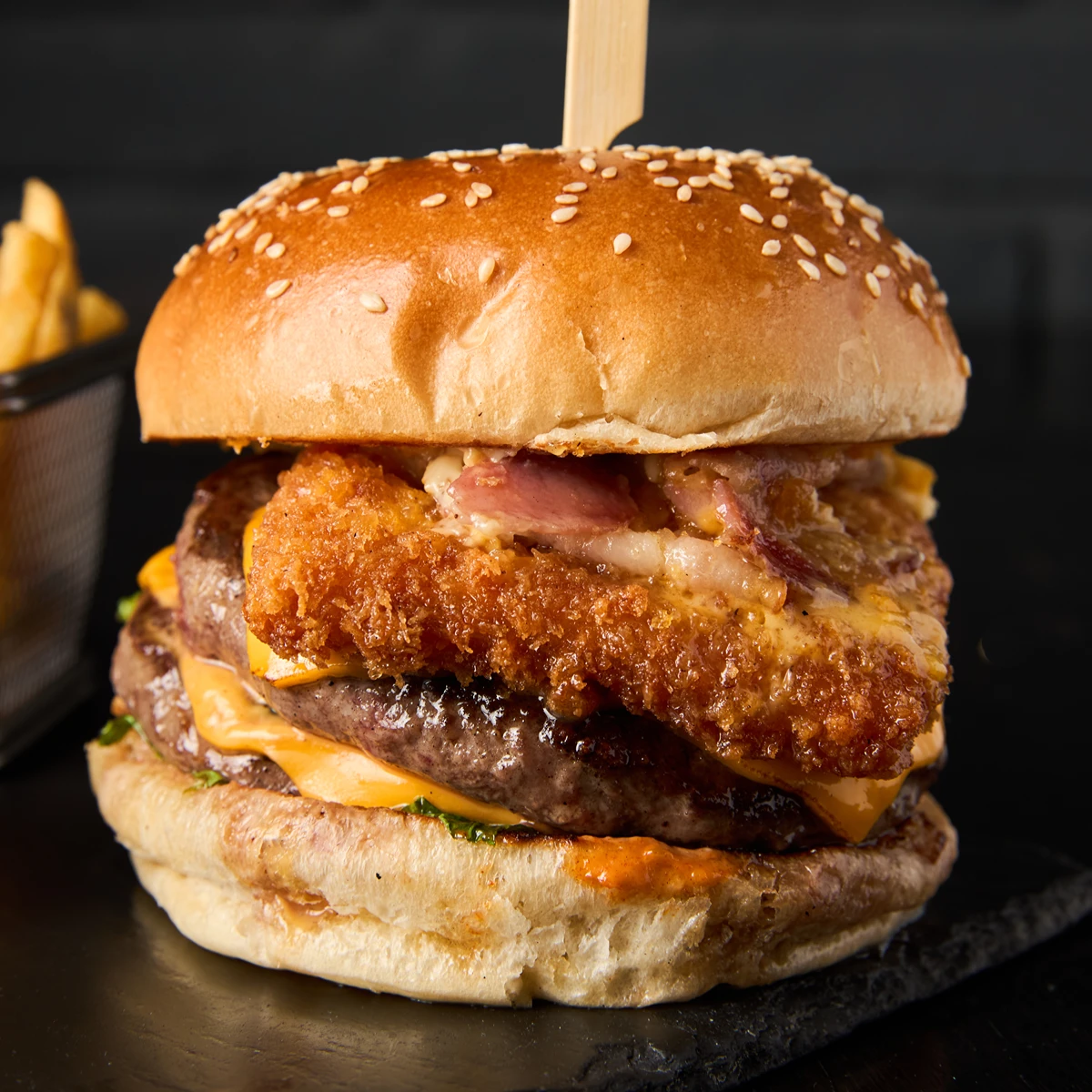 Beef cutlet, double cheddar cheese, breaded white cheddar cheese, bacon, maple syrup, cheese sauce, romaine lettuce.