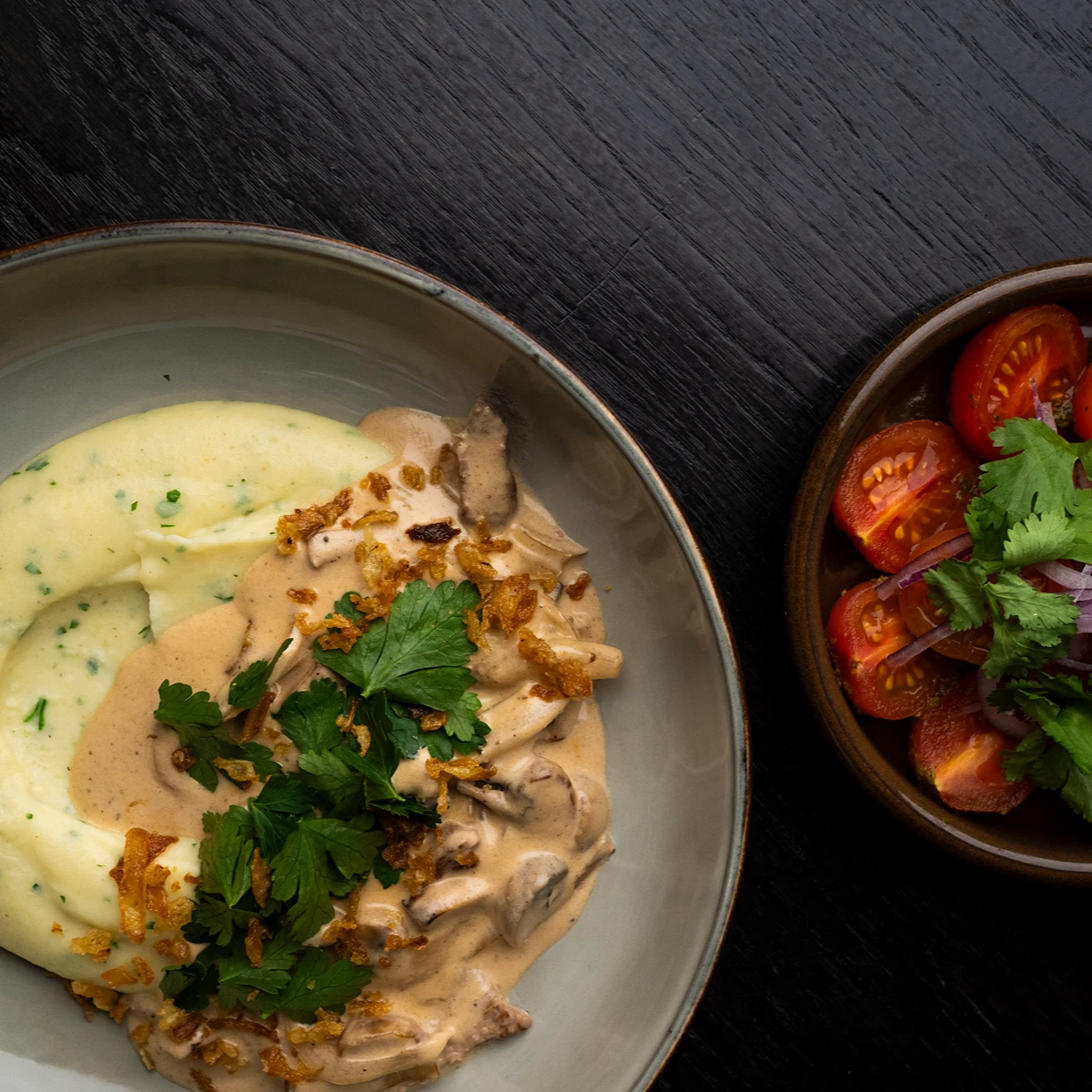 Mashed potatoes, beef, mushrooms, onions, creamy base, pickled tomatoes, dried porcini mushrooms, herbs, crispy onions