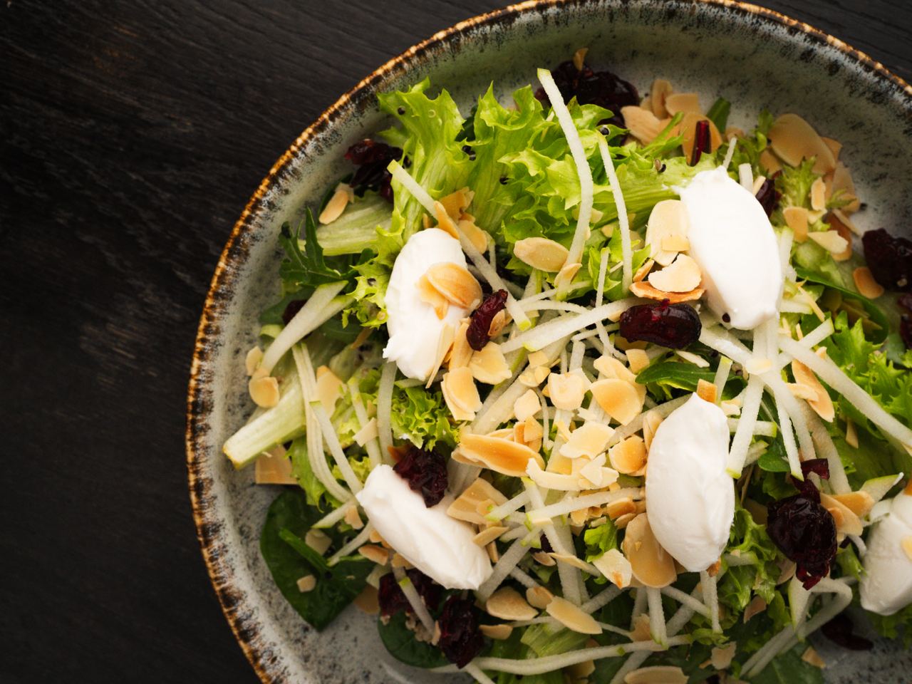 Mixed salad, dried cranberries, goat cheese, Granny Smith apple, almond…