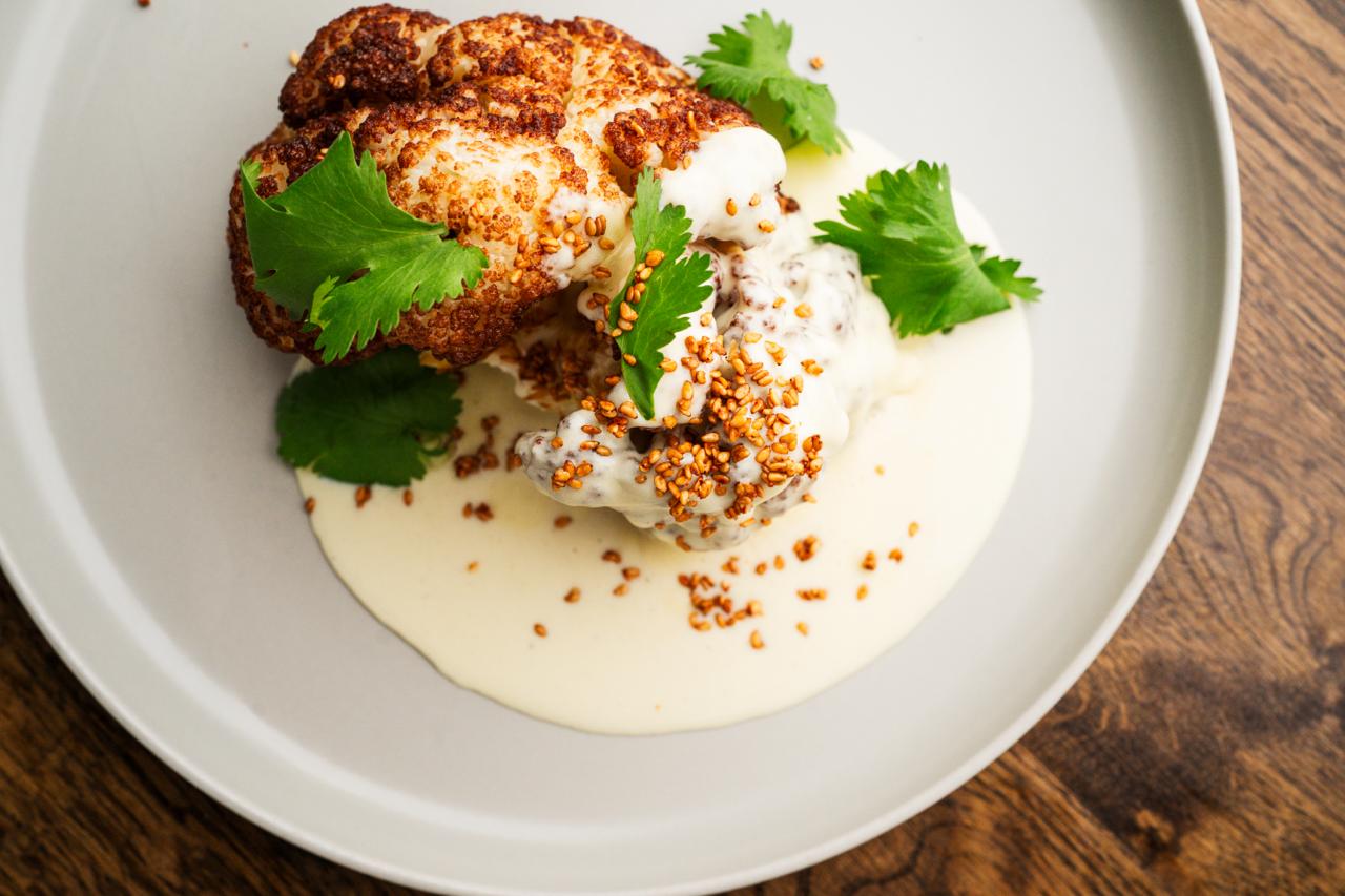 Cauliflower, roasted cream, mustard, spicy sesame, cilantro.