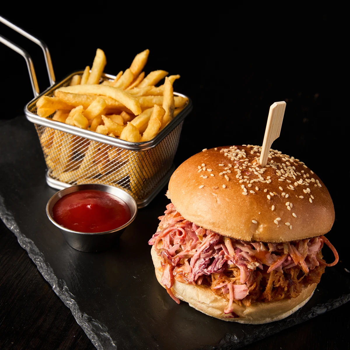 Pulled pork in BBQ sauce, kimchi cabbage, coleslaw salad