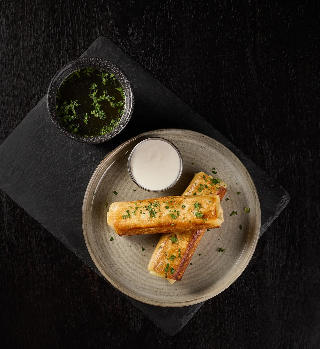 Two crepes (chicken and pork minced meat, carrots, onions), sour…