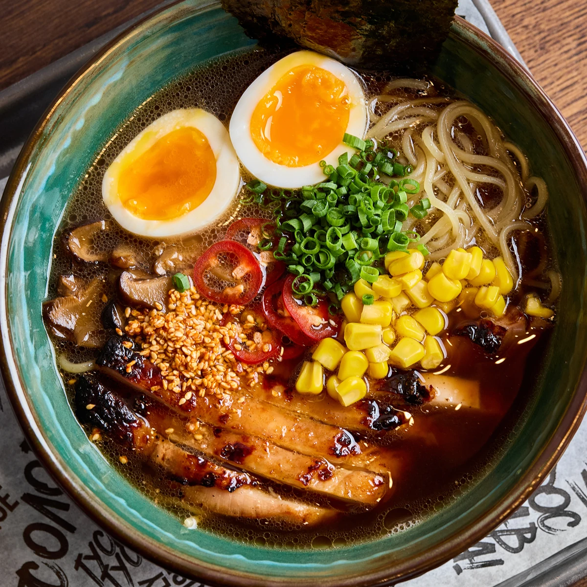 Meat broth, udon noodles, shiitake mushrooms, pickled corn, nori leaves,…