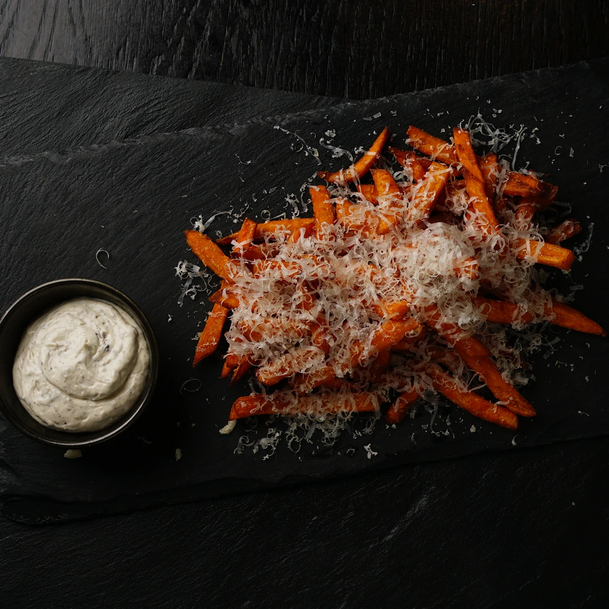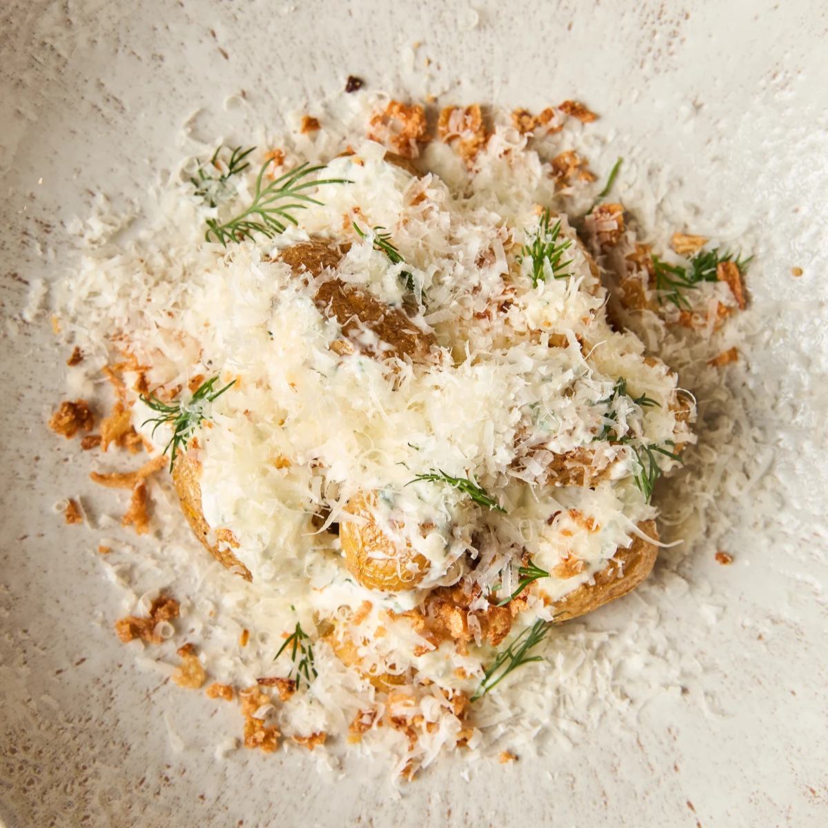 Baked potatoes with cheese and garlic cream, dill, crispy onions,…