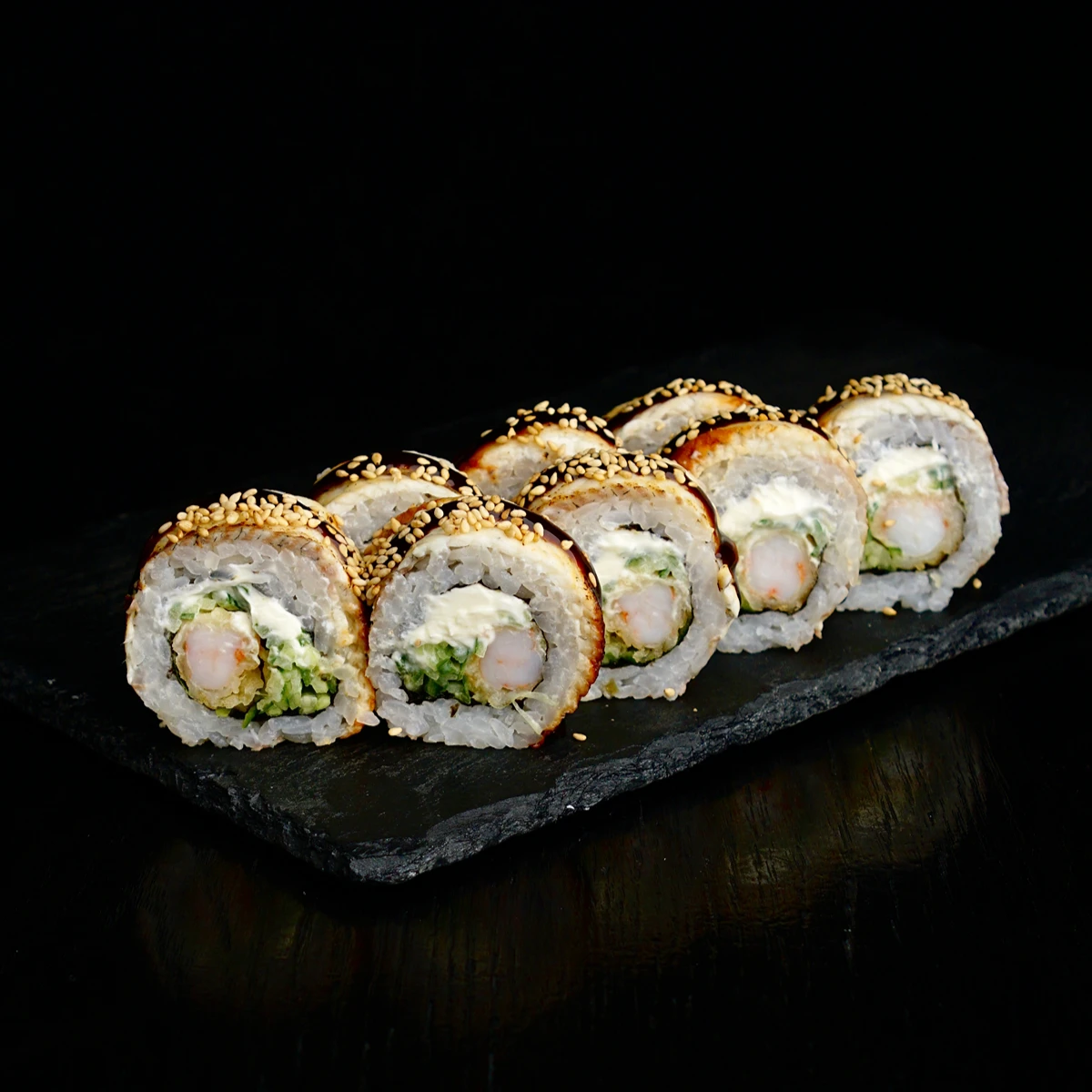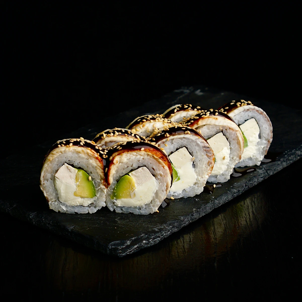 eel, Philadelphia cheese, avocado, tofu cheese, unagi sauce, sesame seeds