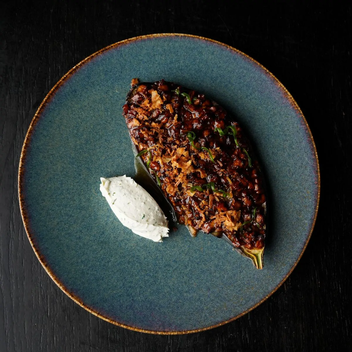 Баклажан, вугор, соус унагі, сирний крем, зелена цибуля, цибуля кріспі