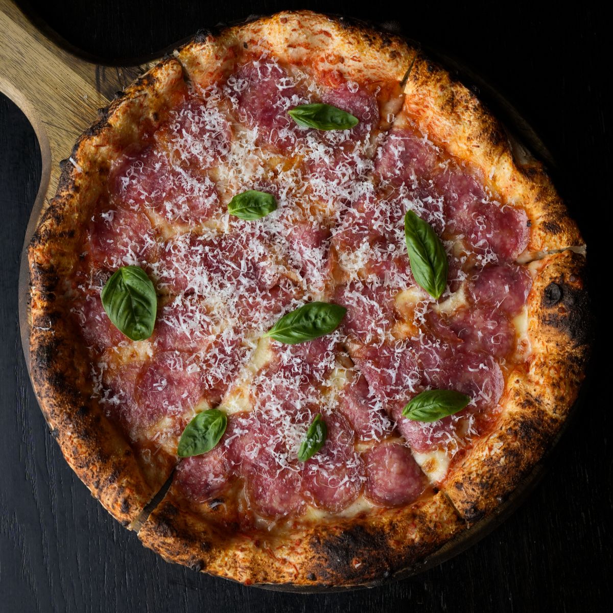 Томатна основа, моцарела, салямі феліно, пармезан, базилік