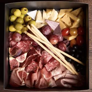 Антіпасті як у доброму винному барі: різні сири, мʼясні делікатеси, фрукти й італійські грісіні. Створено для спільного смакування.