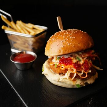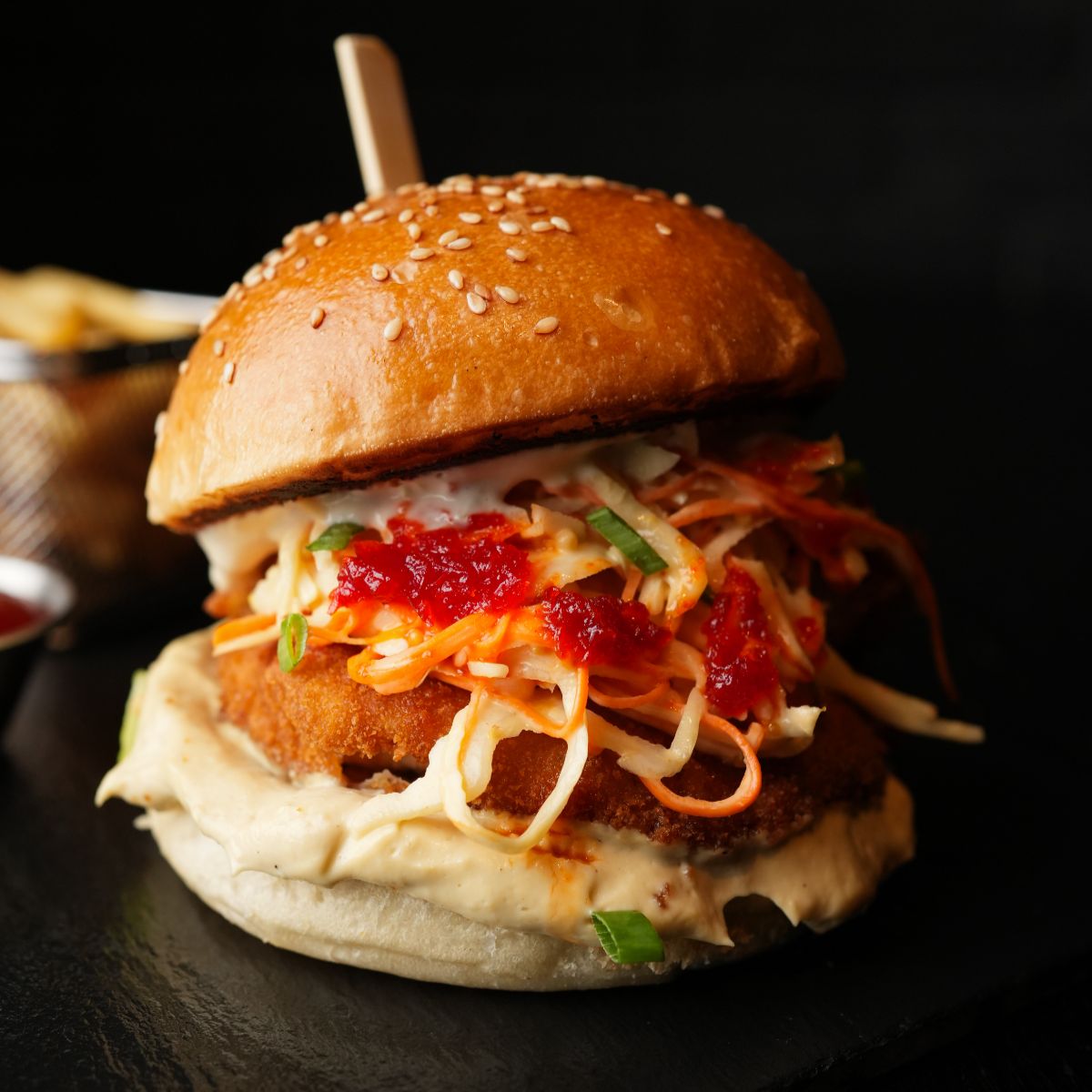 Філе індички в хрусткій паніровці, соус тао-тао, мус із яйця, салат коул-слоу, конфітюр із перцю чилі, зелена цибуля