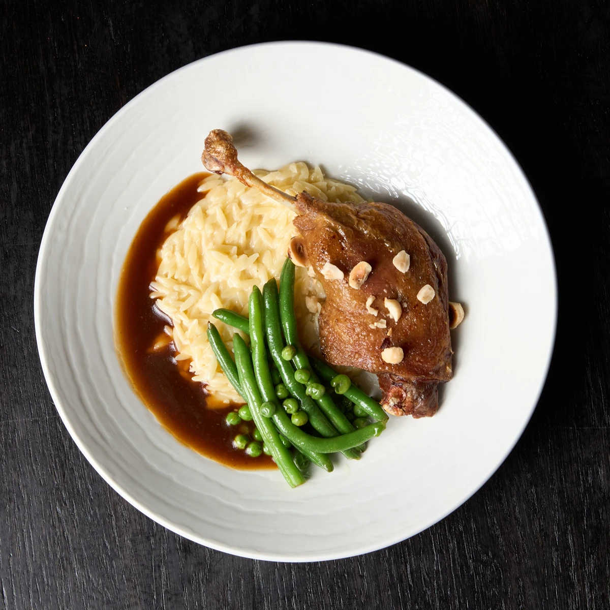 Качина нога конфі в апельсиновій глазурі, орзо, шпарагівка, пармезан, маскарпоне,…